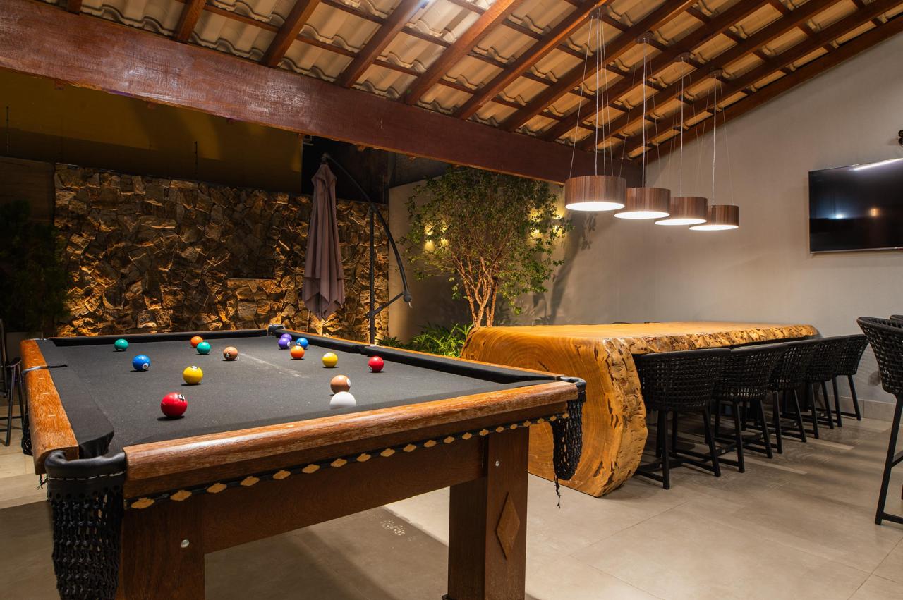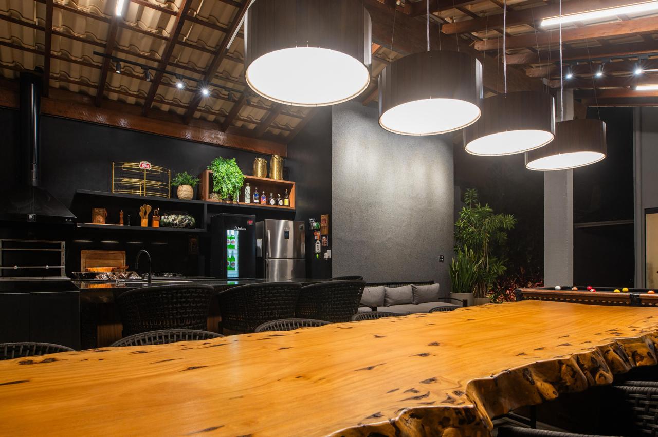 área gourmet com pé direito alto e telhado ventilado em madeira maciça